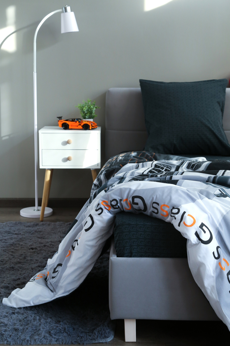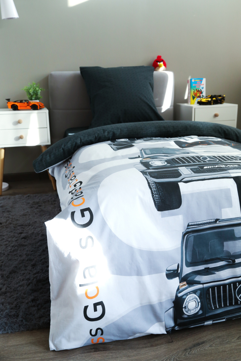 Детское постельное белье 1,5 спальное черное с рисунком автомобиля гелентваген мерседес в сером фоне из ткани поплин на 1.5 спальную кровать. Стильный дизайн гелентваген машинка понравится мальчишкам и подарит яркие мечты и сны. Постельное белье из натуральной ткани плотности 115 гр/м2, состоящий из 100% хлопка, абсолютно экологичен, не вызывает аллергии, хорошо пропускает воздух, позволяя телу дышать. При правильном уходе постельное белье 1.5 спальное с машиной прослужит вам долгое время. Предварительная стирка обязательна. Перед стиркой вывернуть изделие на изнаночную сторону. Стирать отдельно от синтетических изделий. Машинная стирка при максимальной температуре 40С, мягкий режим. Постельное белье детское 1,5 спальное с машинками стирать моющими средствами для цветных тканей. Не отбеливать. Гладить с изнаночной стороны при максимальной температуре утюга. Усадка после стирки до 3%, от заявленных размеров изделия. Ткань не подвержена образованию катышков.