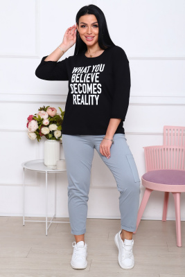 Костюм Кэжуал, стильная и элегантная футболка с рукавом 3/4 с подворотами и с печатью на полочке. Спинка футболки немного длиннее полочки. Брюки укороченные с подворотами, с одним карманом на левой брючине, пояс широкий, эластичный, комфортный.